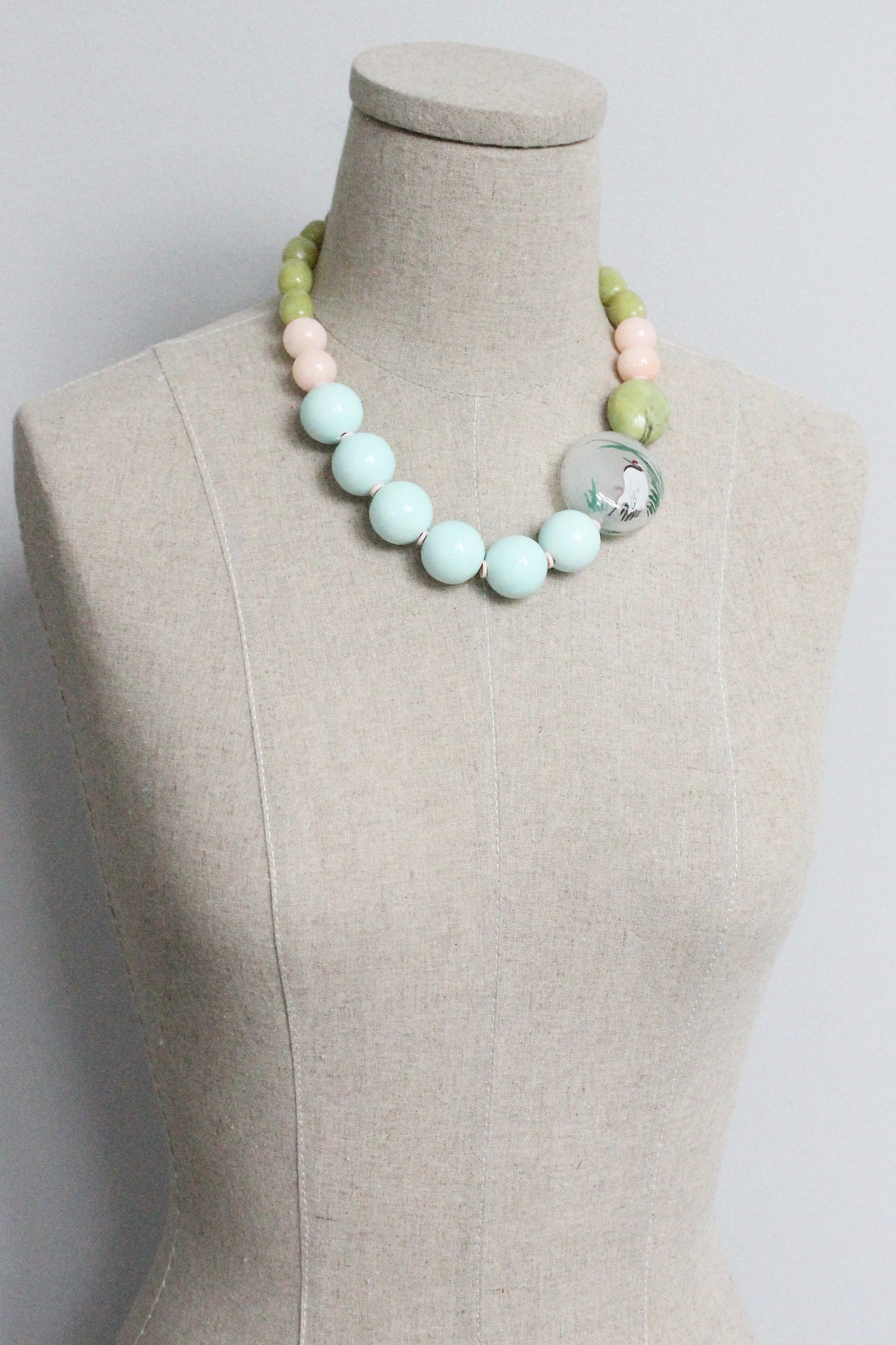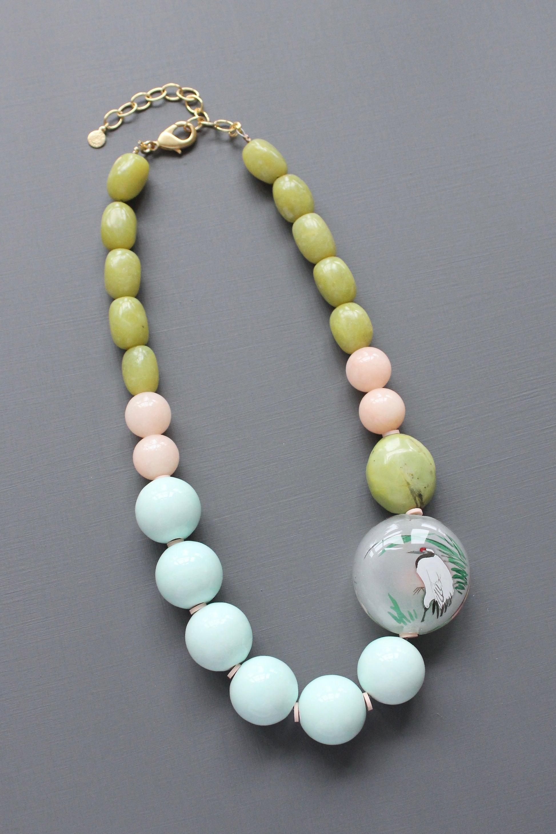 Mixed pastel stone and ceramic beads with reverse painted red-crowned crane glass focal bead. Measures 18 inches long. 3 inch extender.
