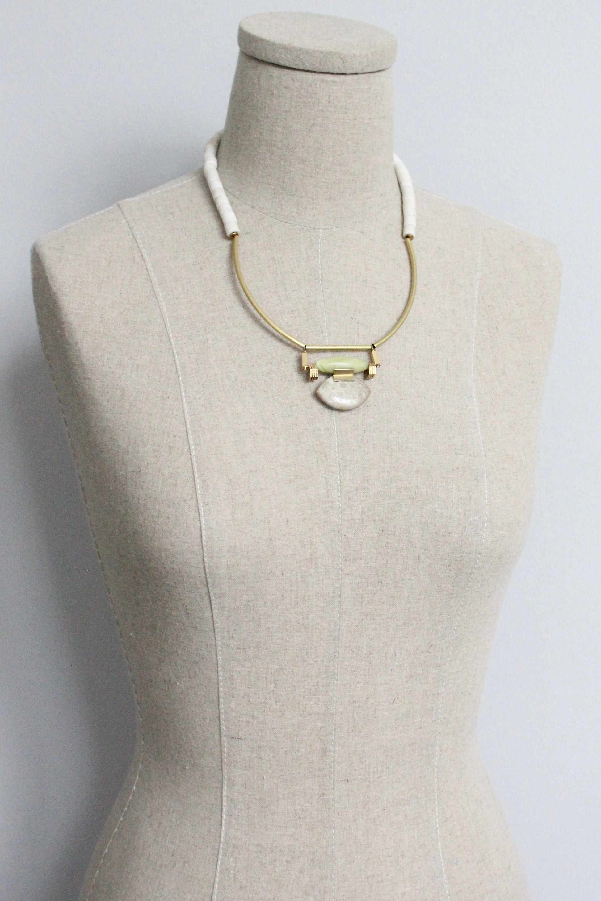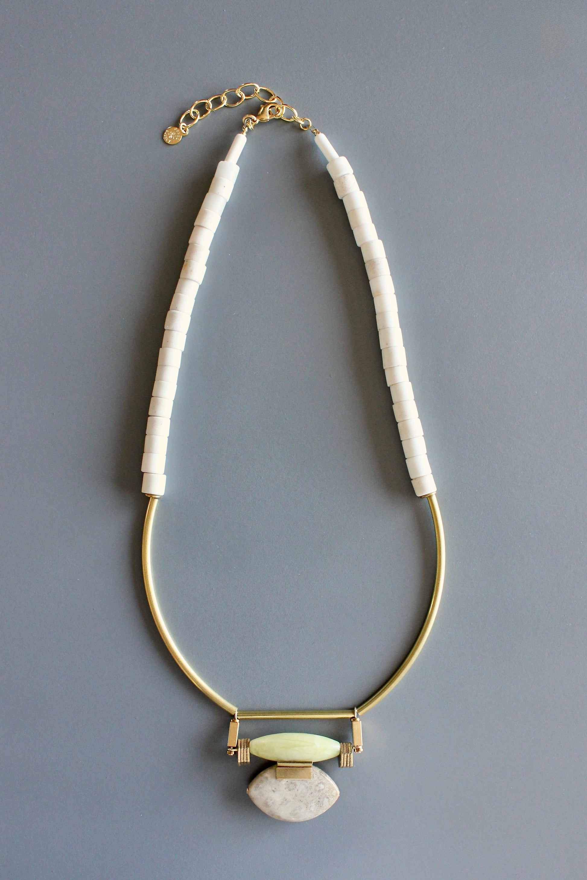 White Nigerian Goomba beads with yellow jade and jasper geometric pendant. Measures 19 inches long. 2 inch extender.