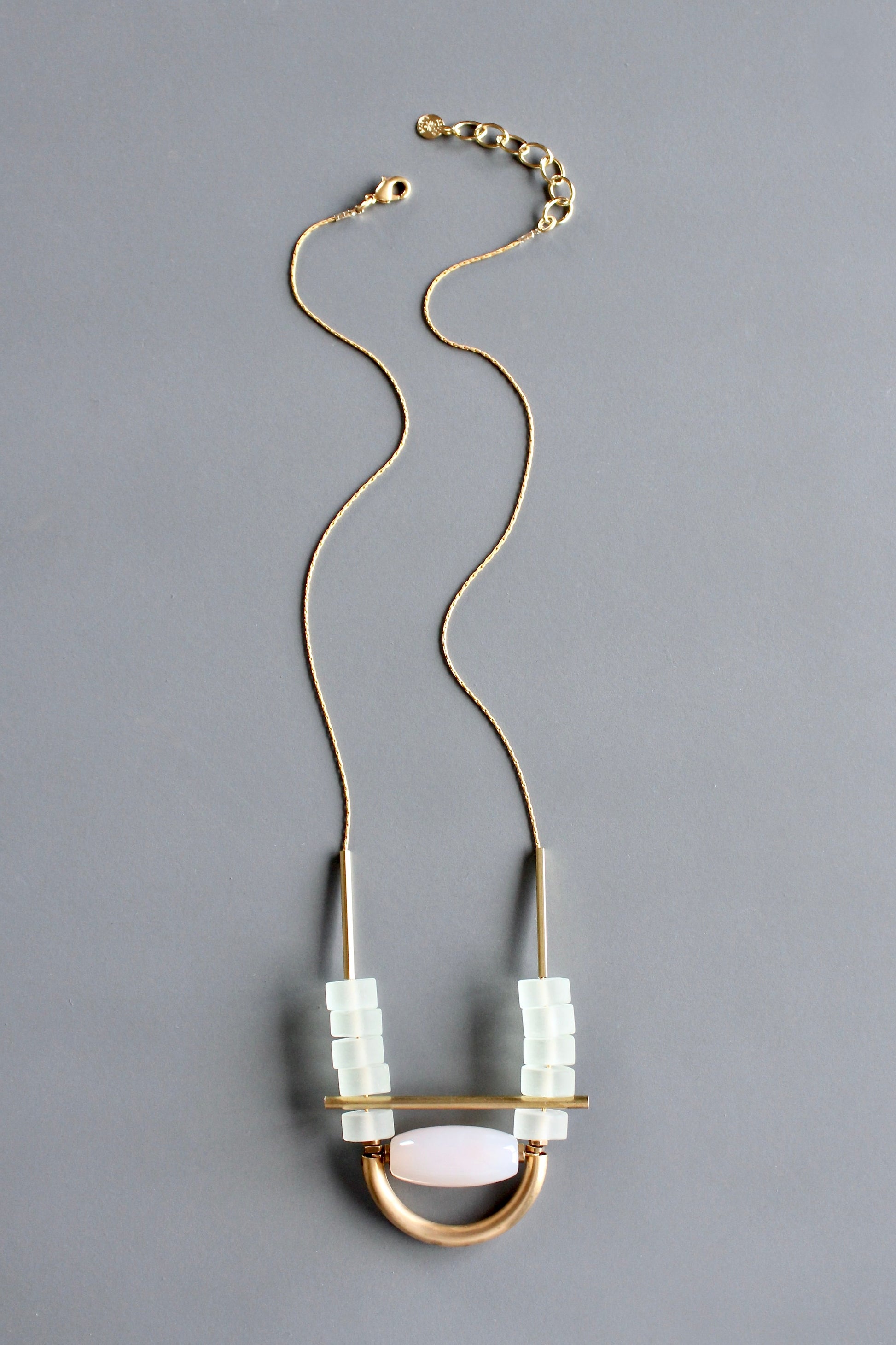 Frosted pale green glass beads with oval agate stone and curved brass pendant on gold tone plated chain. Measures 21 inches long. 2 inch extender.