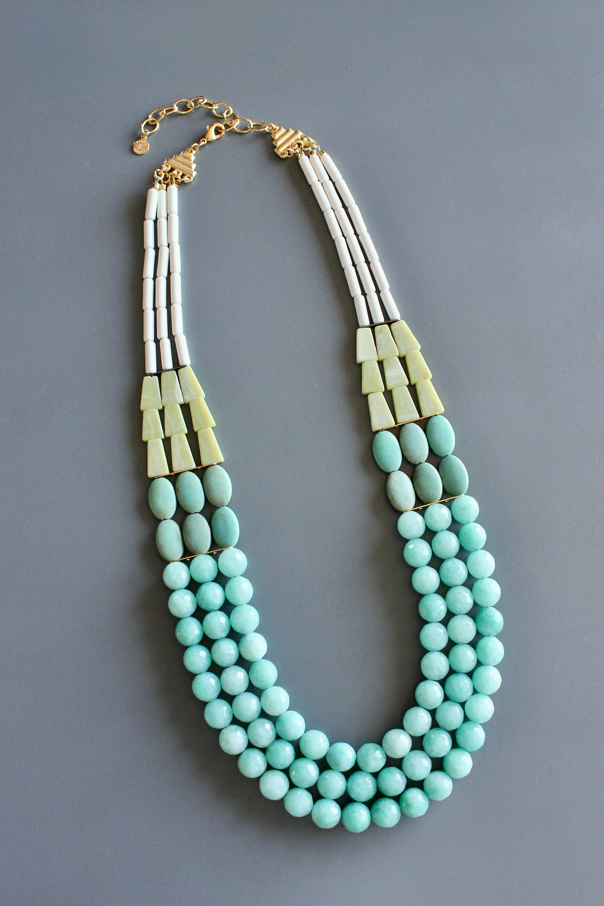Multi-strand necklace with amazonite beads, oval turquoise, yellow jade trapezoids, and white magnesite tubes. Measures 22 inches long. 3 inch extender.