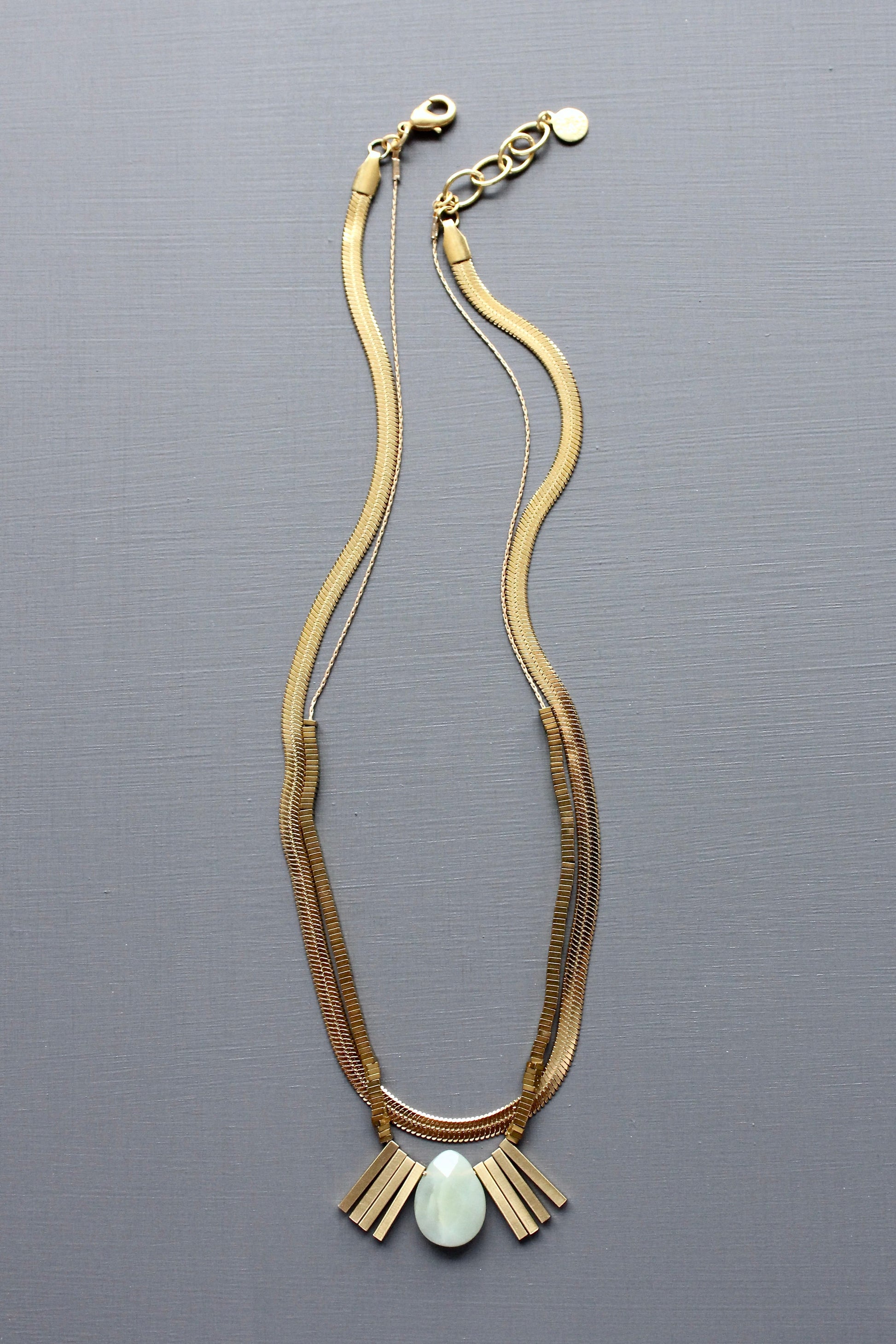Layered gold tone plated snake chains with pale green jade bead and brass bar fringe accents. Measures 16 inches long. 1 inch extender.