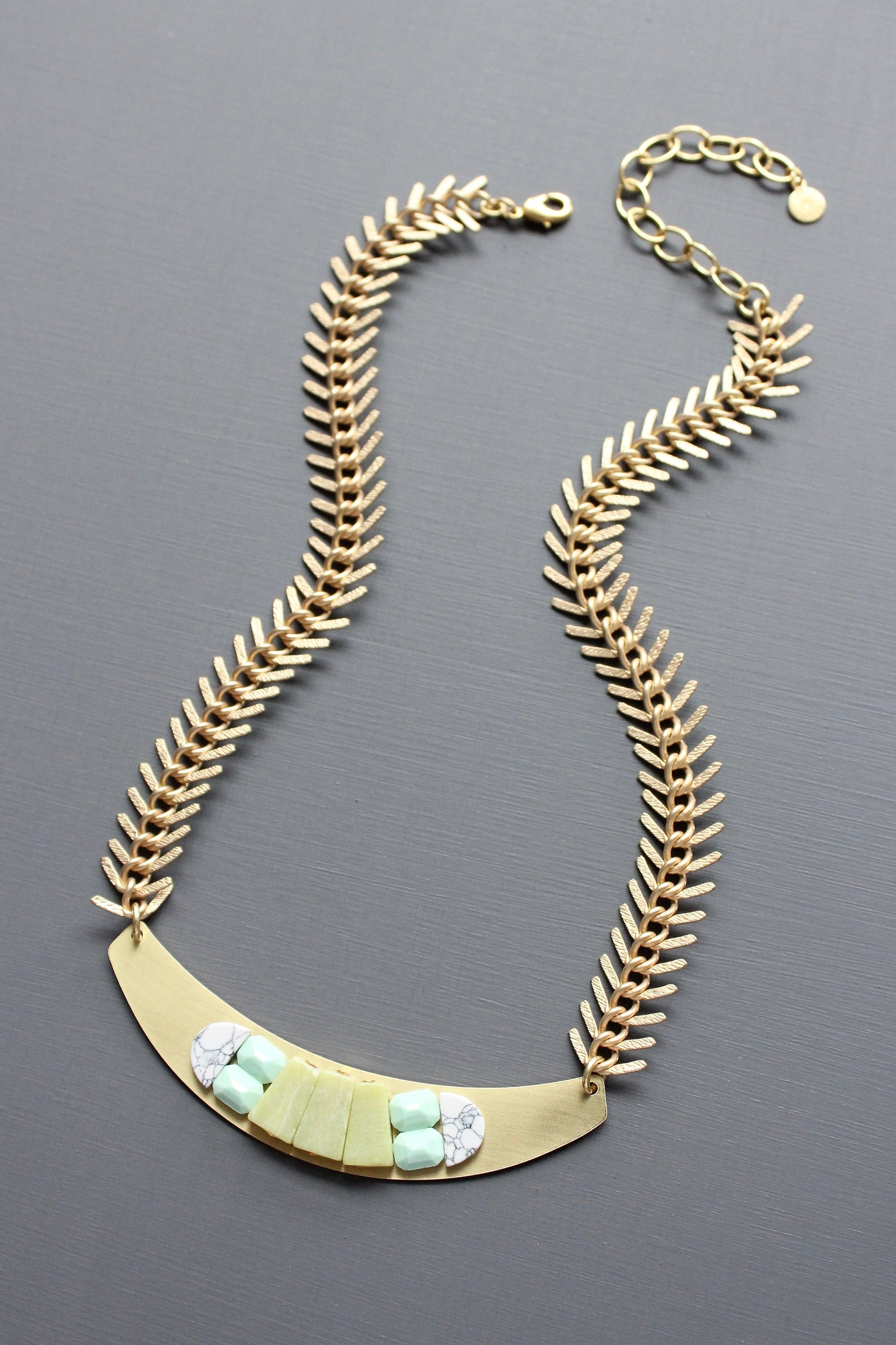 Brushed brass crescent pendant with vintage pale green glass, yellow jade, and white stone inlay on a chunky 18k gold plated fishbone brass chain. Measures 16 inches long. 3 inch extender.