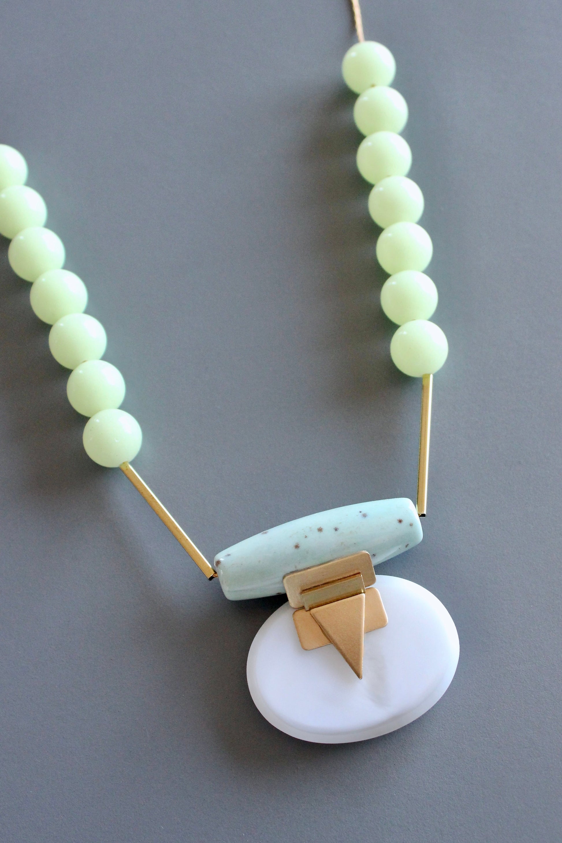 Celadon stone beads with turquoise, white glass oval pendant and brass triangle accent on gold tone plated chain. Measures 24 inches long. 2 inch extender. **Features select phosphorescent beads that emit a soft glow in low light.