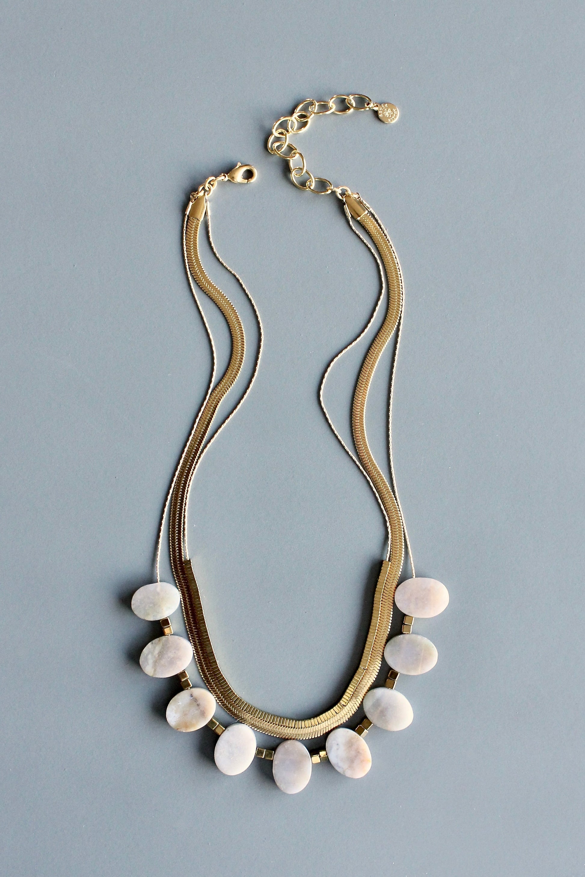 Layered brass snake chains with agate beads and hematite accents on gold tone plated chain. Measures 16 inches long. 3 inch extender.