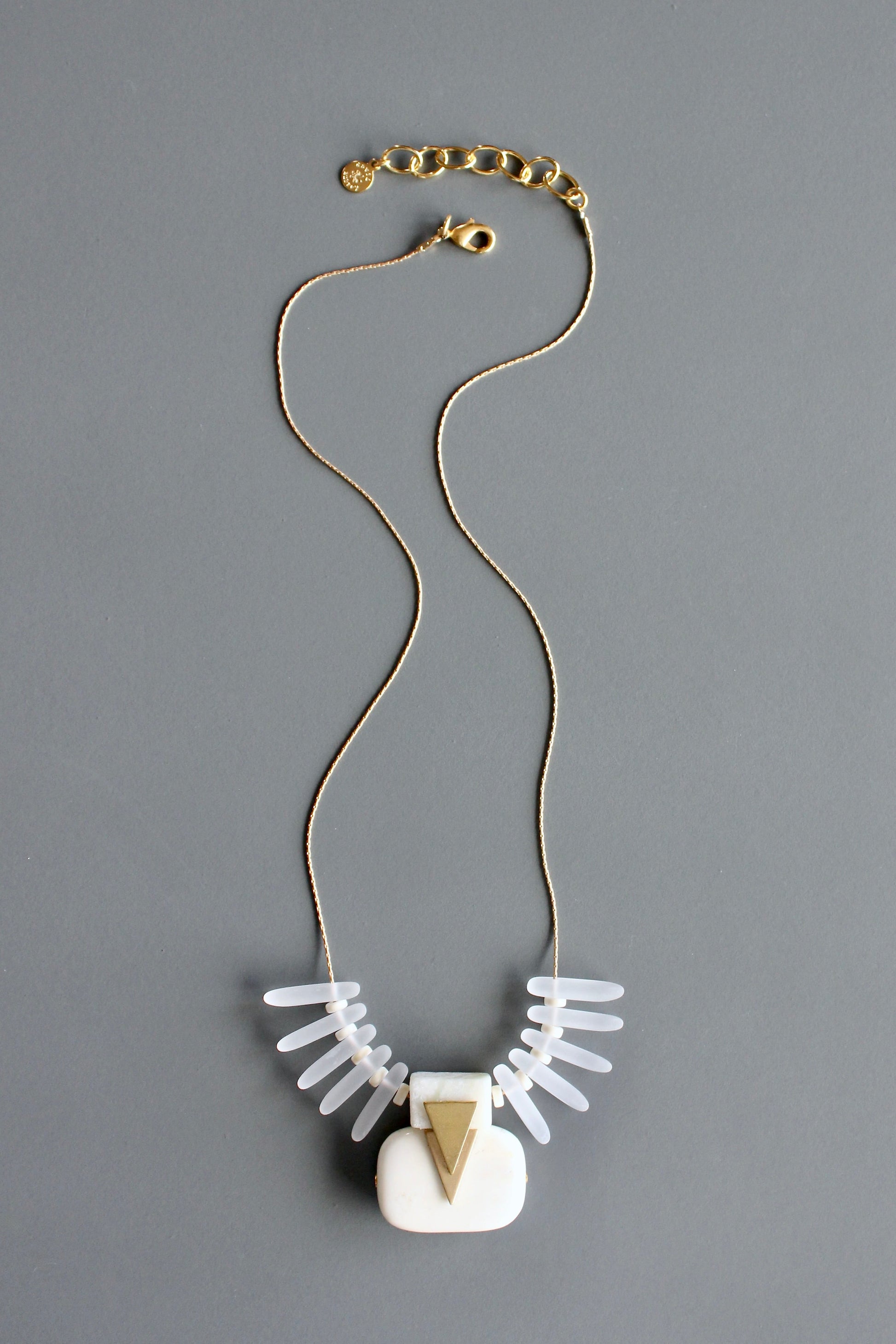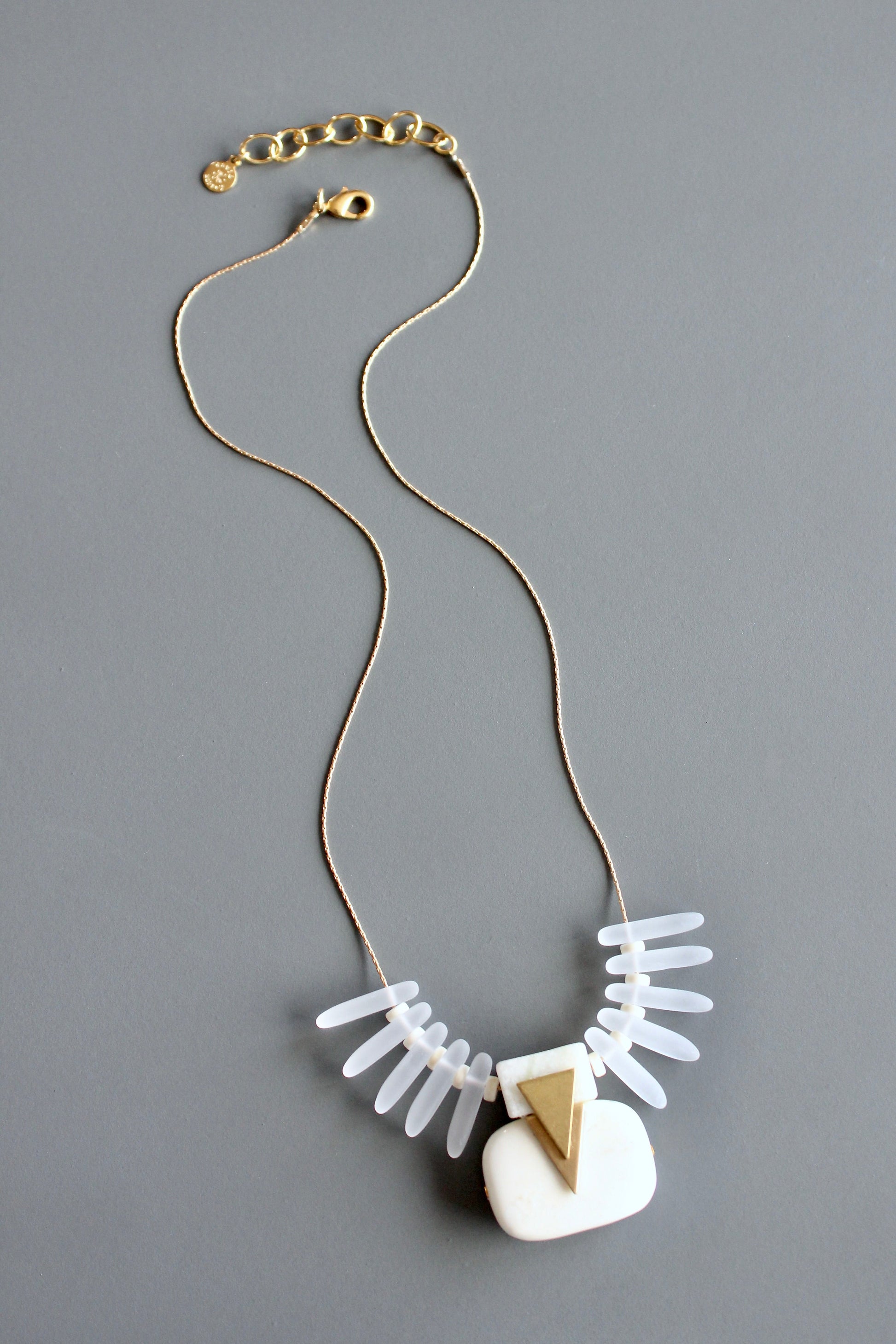 White frosted glass beads with geometric brass accent and white stone pendant on gold tone plated snake chain. Measures 18 inches long. 2 inch extender.