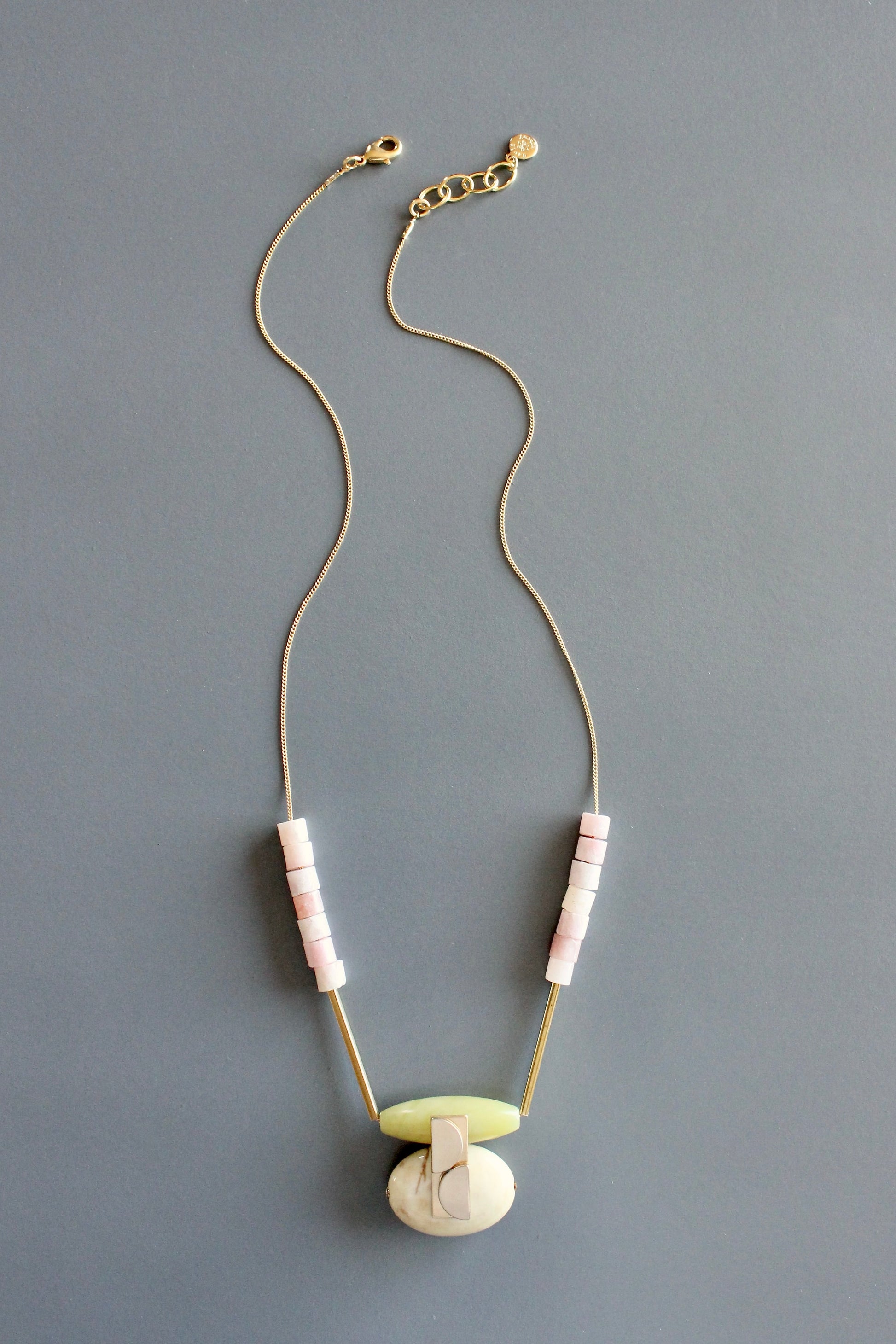 Blush beads with green jade and jasper pendant and brass accents on gold toned plated chain. Measures 20 inches long. 1 inch extender.
