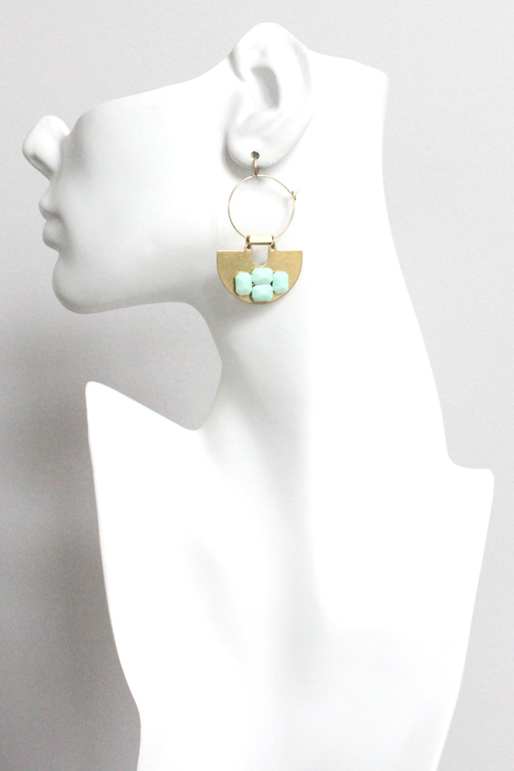 Brass finding with vintage celadon glass stones on 18k gold plated hoop. Each earring weighs .19 oz and measures 2 inches long.
