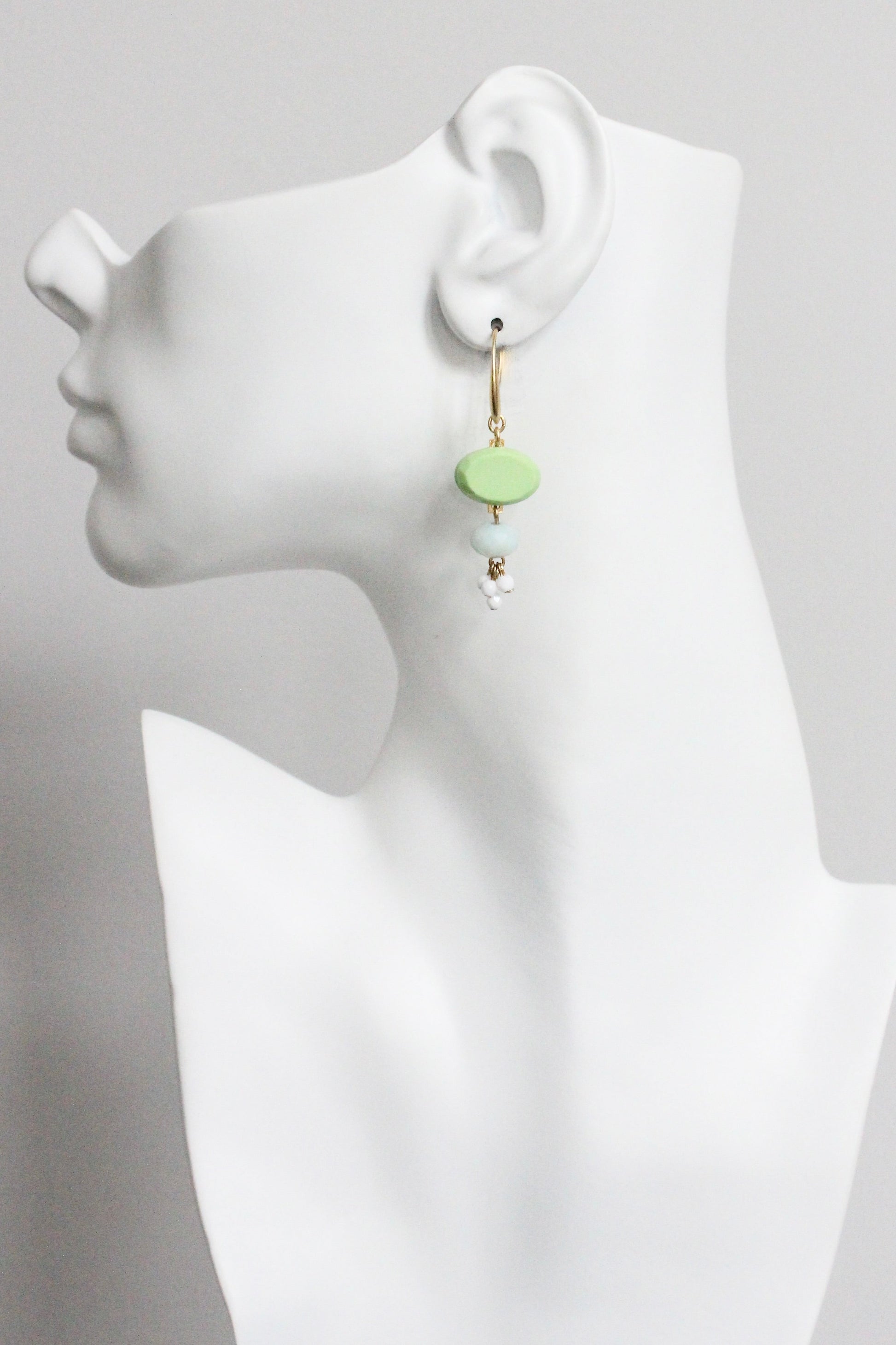 Vintage mint green oval cabochons with amazonite and white glass cluster drop on 18k gold plated ear wire. Each earring weighs .17 oz and measures 2 inches long.