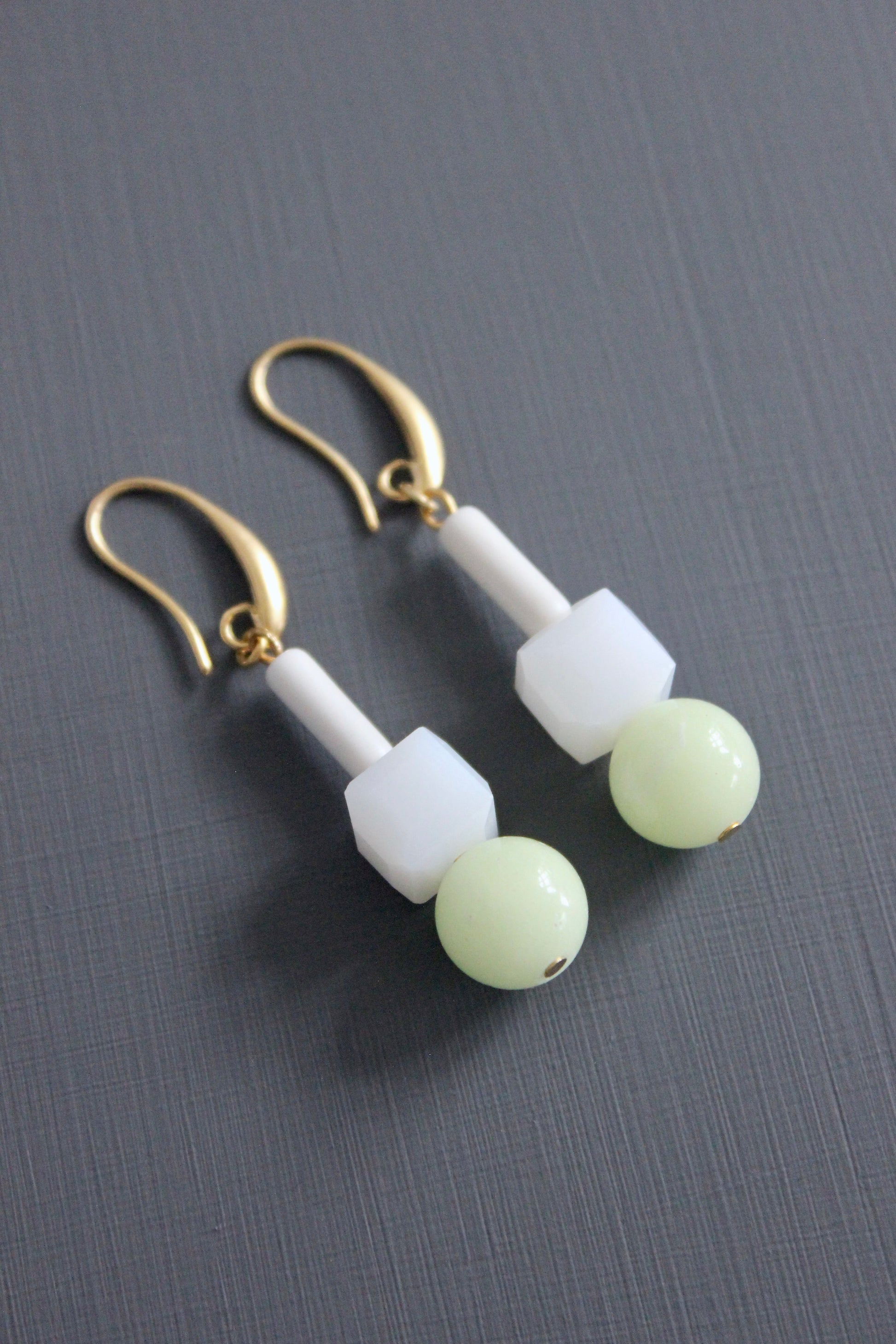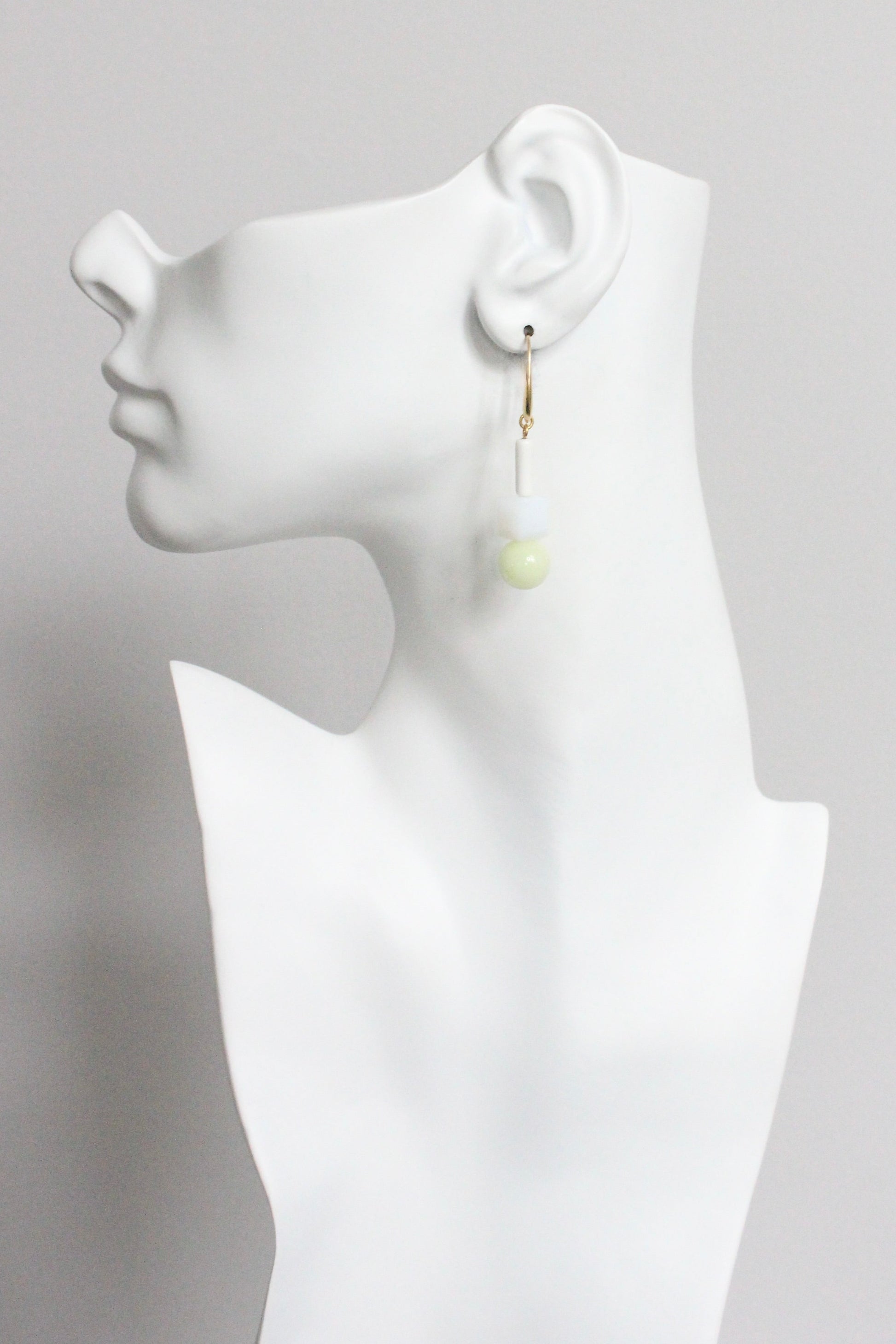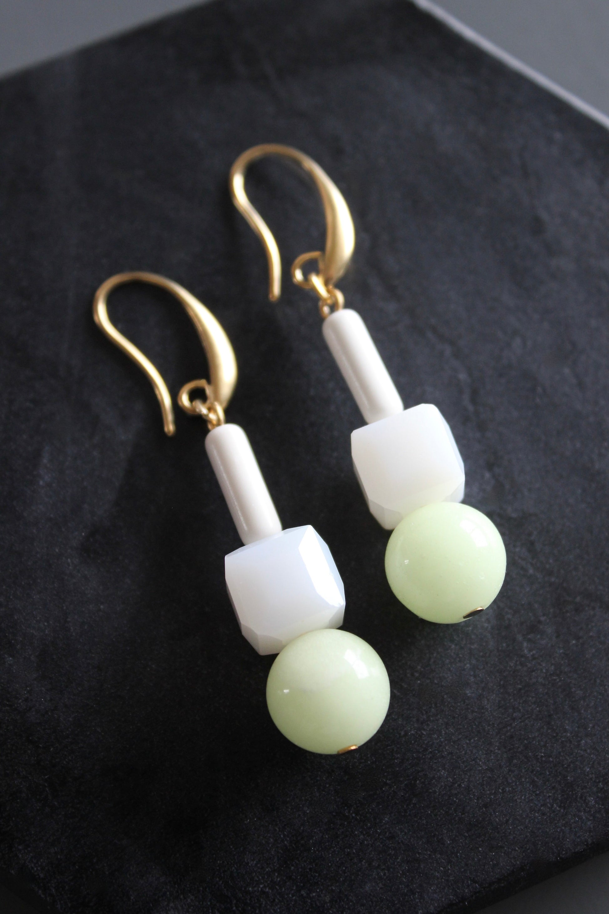 Stacked white magnesite beads with white glass cube and celadon glass bead on 18k gold plated ear wire. Each earring weighs .16 oz and measures 2.25 inches long. **Features select phosphorescent beads that emit a soft glow in low light.