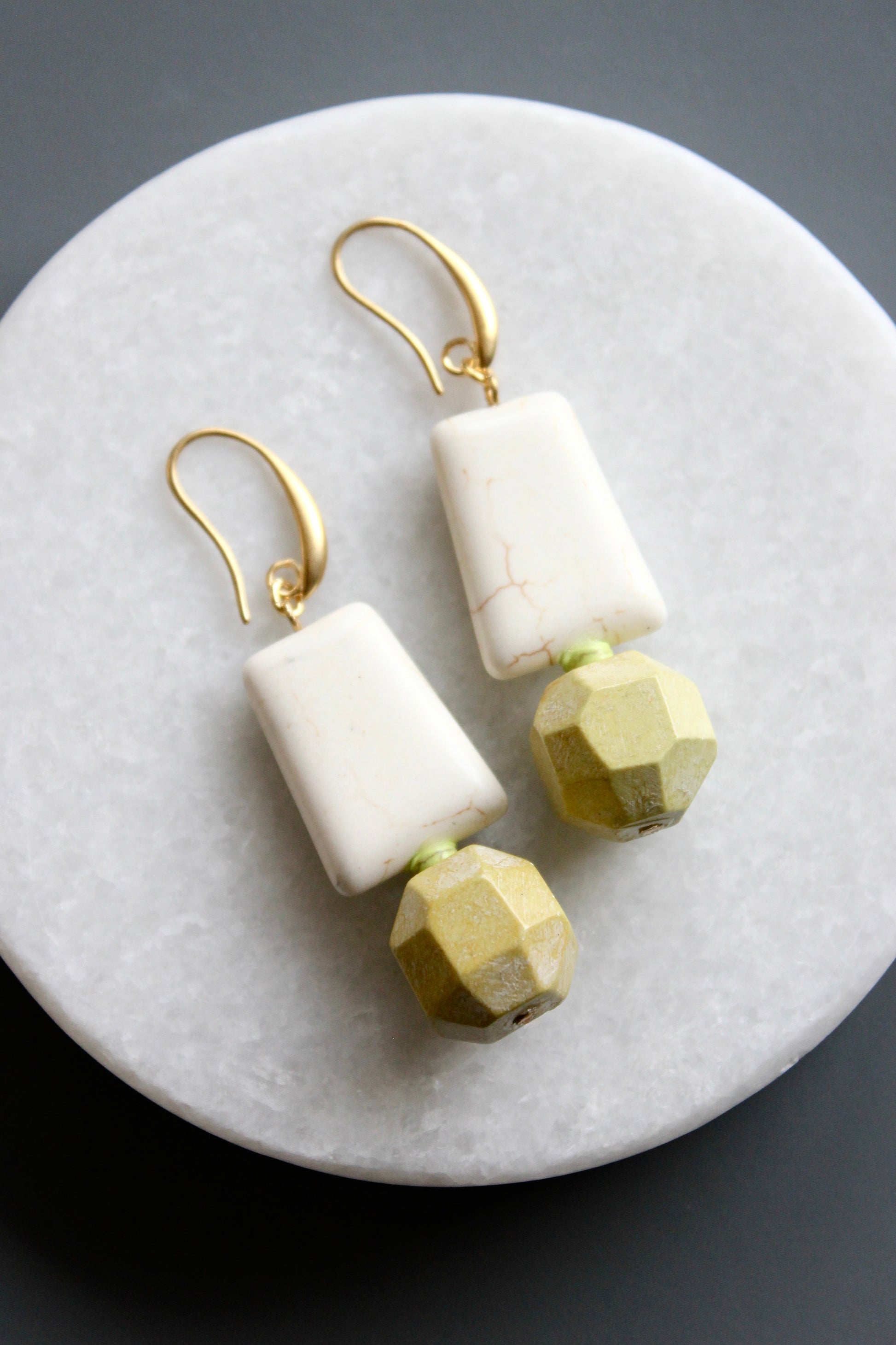 White magnesite trapezoid bead with faceted yellow turquoise stone accent on 18k gold plated ear wire. Each earring weighs .39 oz and measures 2.5 inches long.