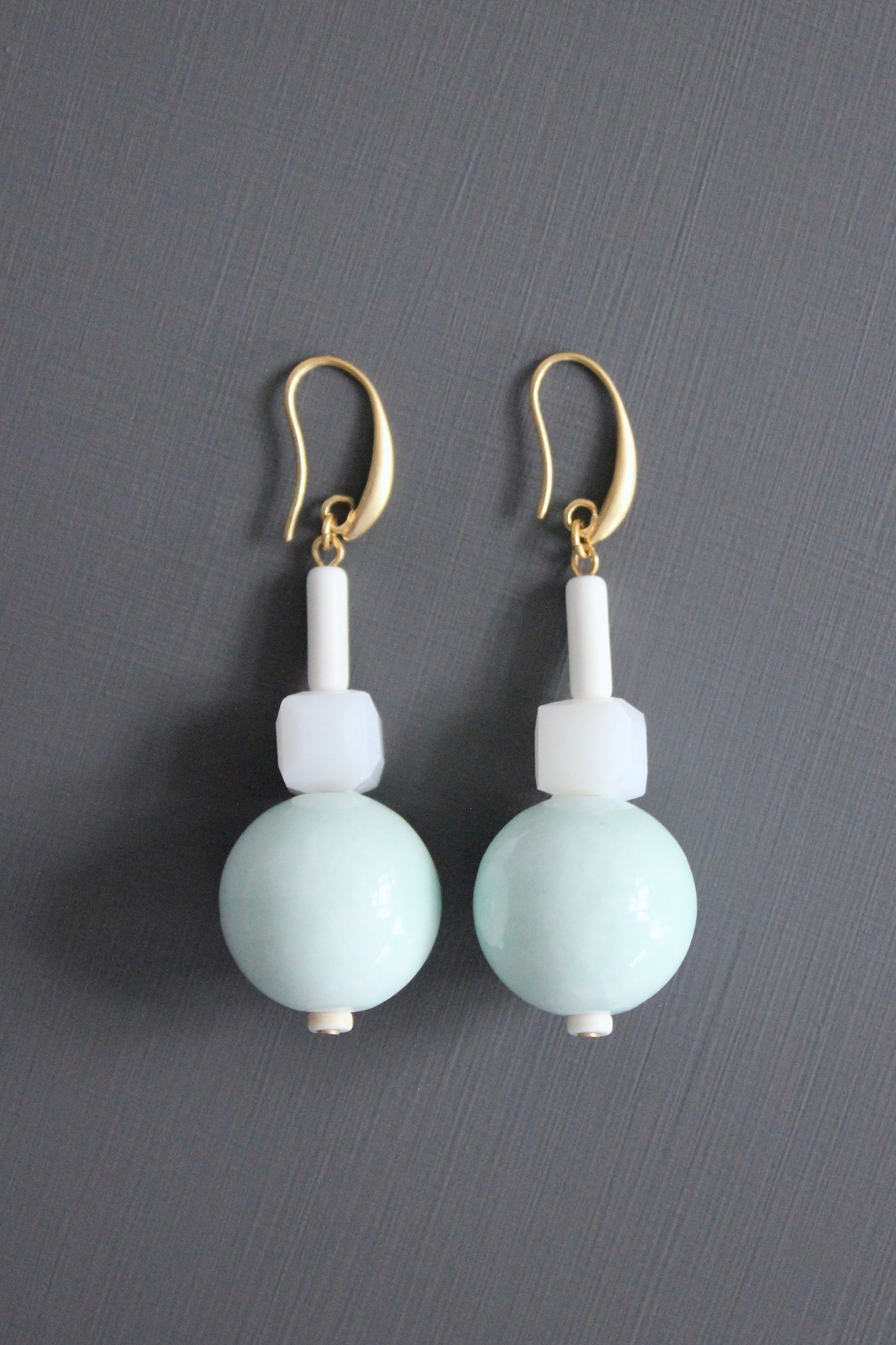 Large pale aqua ceramic bead with white cube bead and white magnesite tube on 18k gold plated ear wire. Each earring weighs .49 oz and measures 2.75 inches long.