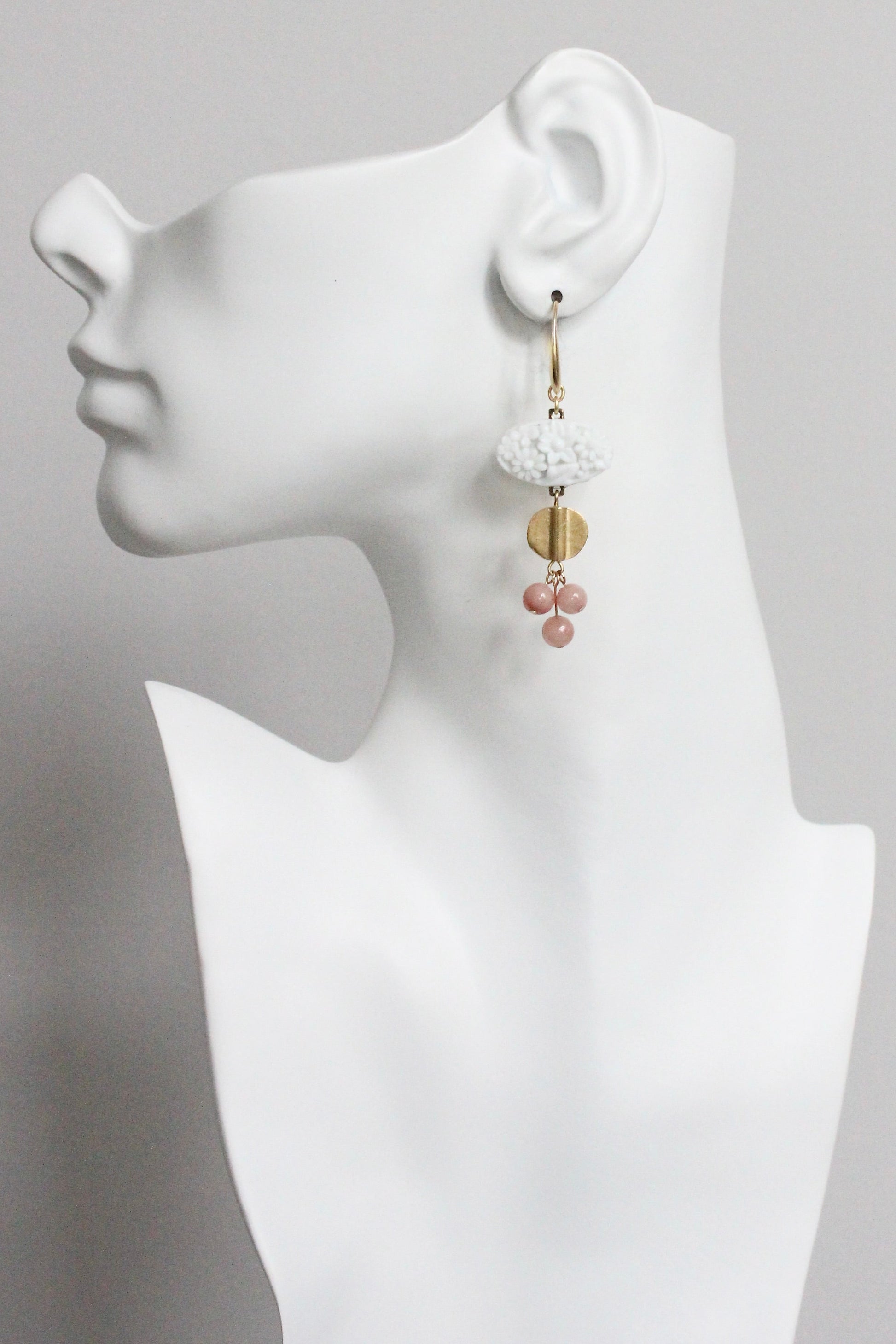 Vintage chalk white carved Japanese pressed glass cabochons with brass disc and mauve jade beads on 18k gold plated ear wire. Each earring weighs .255 oz and measures 2.625 inches long.