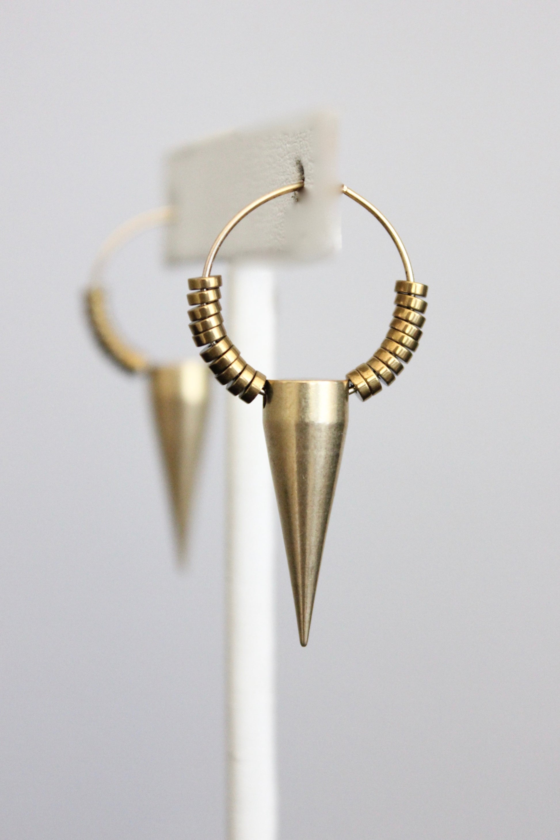 18k gold plated small brass hoop earrings with plated hematite and brass spikes.1.5 inches.