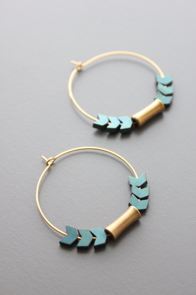 18k gold plated brass hoop earrings with plated hematite and brass bead. 1.5 inches in diameter.