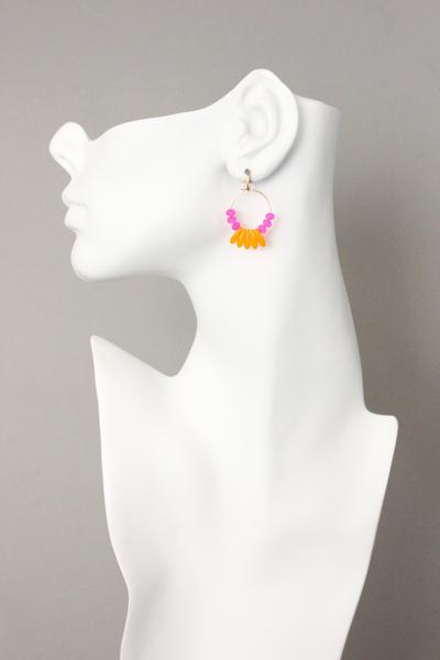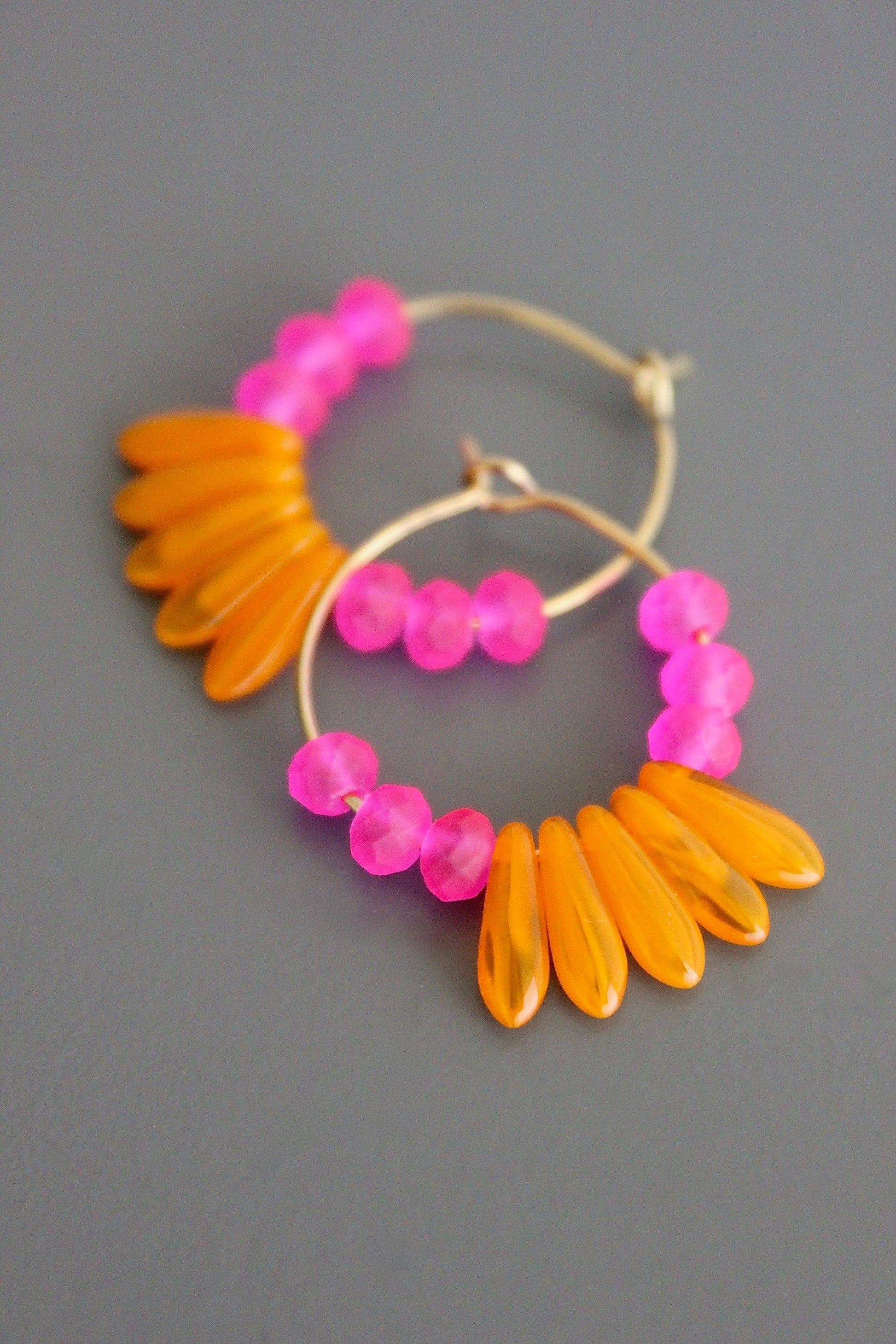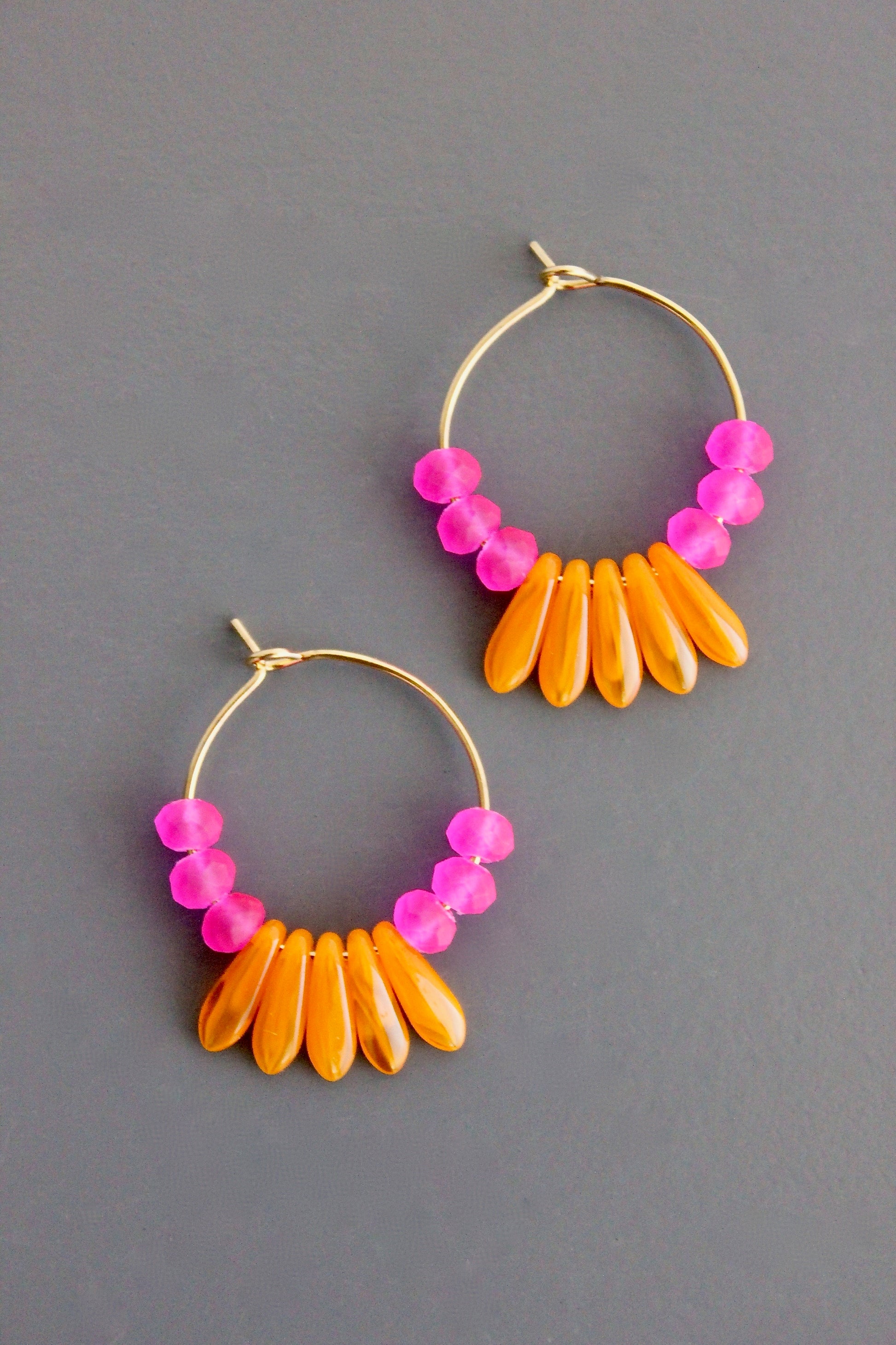 18k gold plated brass hoop earrings with matte pink glass and Czech glass.