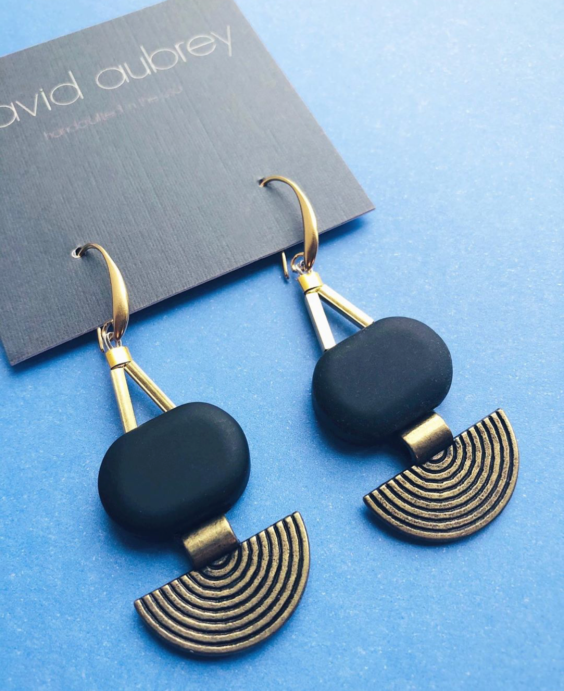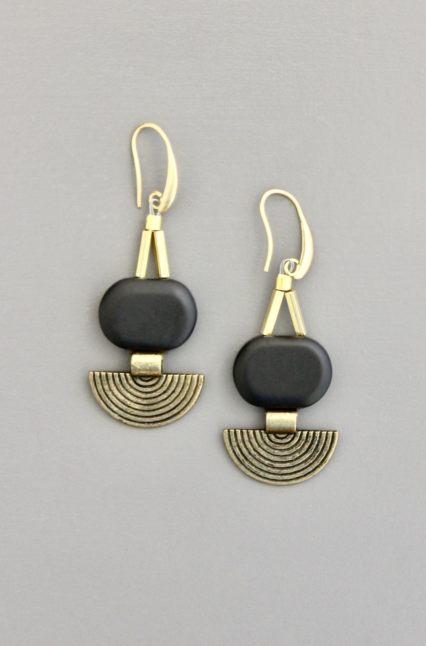 18k gold plated hook earrings with black agate and brass. *Please note new oval version of black agate stone. Each half pair weighs .29 oz and measures 2.6 inches
