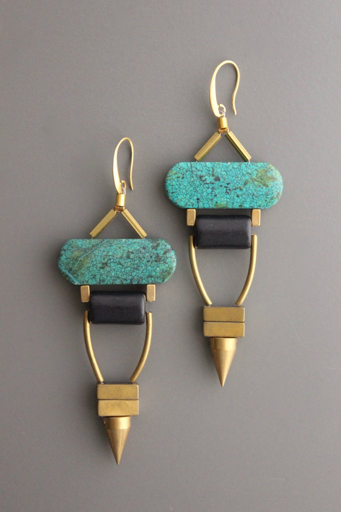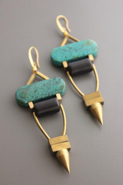 18k gold plated hook earrings with turquoise,magnesite, plated hematite, and brass.
