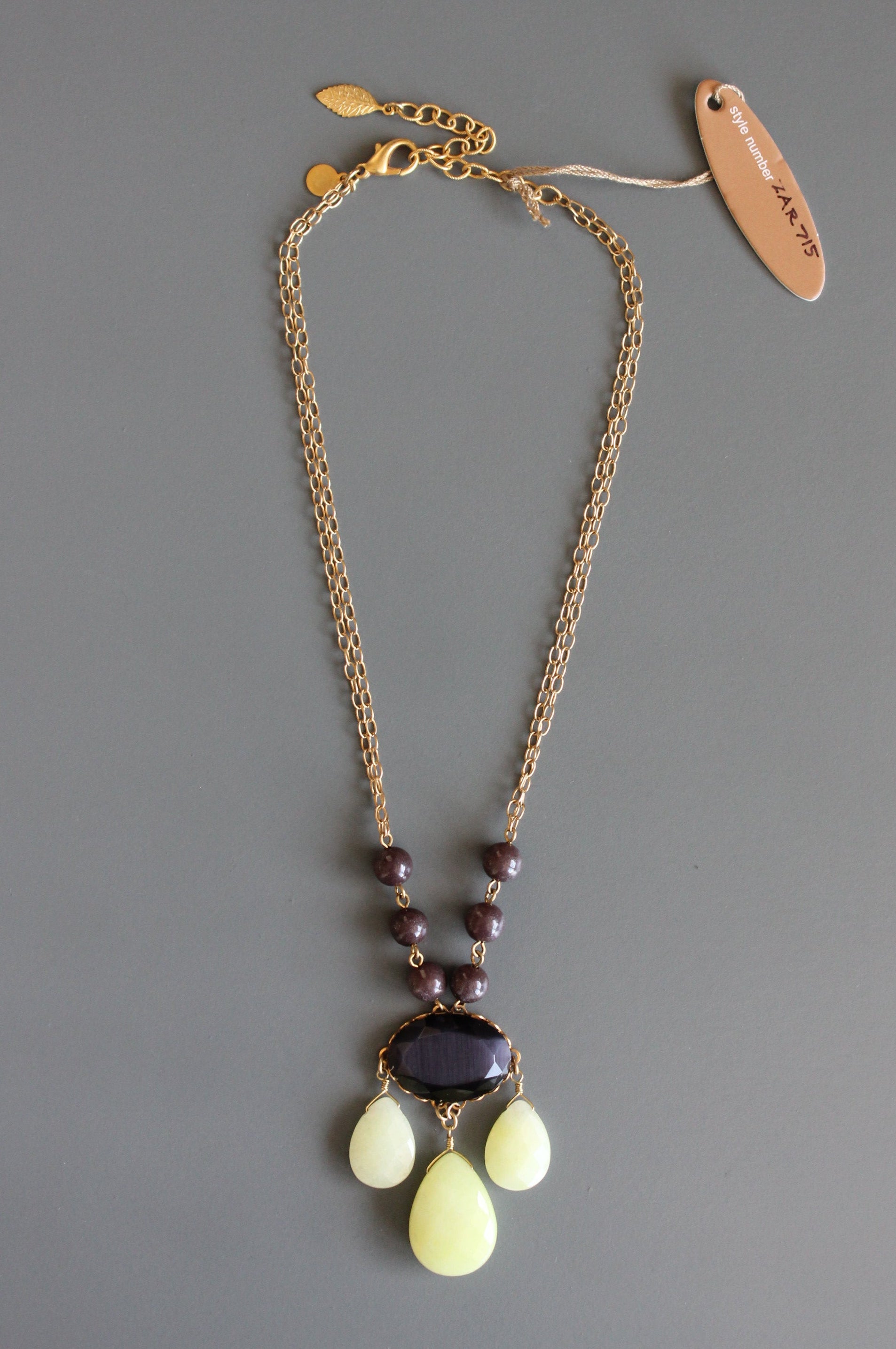 15 inch pendant necklace with 18k gold plated chain, glass, and dyed jade.